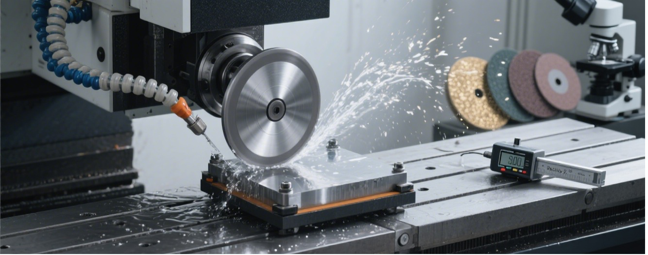 研削機は、高速回転するホイールを使ってワークの表面を研磨し、研磨剤の粒子が微細な凸凹や欠陥を削り取って取り除き、高精度で光沢のある表面を生み出す、まさに緻密な研磨機のような役割を果たします。